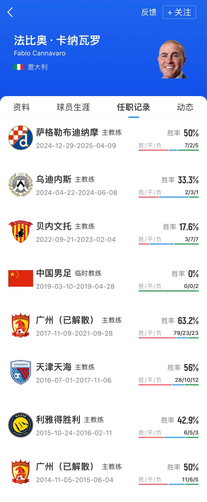 卡纳瓦罗现年52岁,曾执教广州恒大、利雅得获胜 、天津权健、贝内文托、乌迪内斯和萨格勒布迪纳摩。2019年3月-4月,卡纳瓦罗曾出任国足临时主帅,带队征战中国杯,2场赛事 均以0-1的比分不敌乌兹别克斯坦和泰国队。