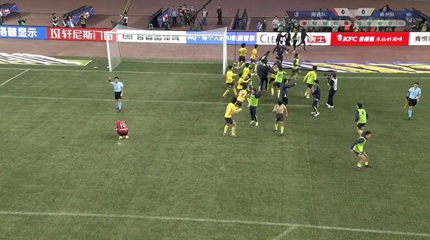 南通领队 第五罚被泰州守门员扑出,泪洒赛场!身后泰州全队疯狂庆祝