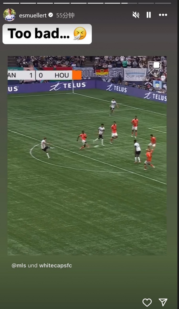 穆勒社媒晒出得分 的视频,配文:“太可惜了。”