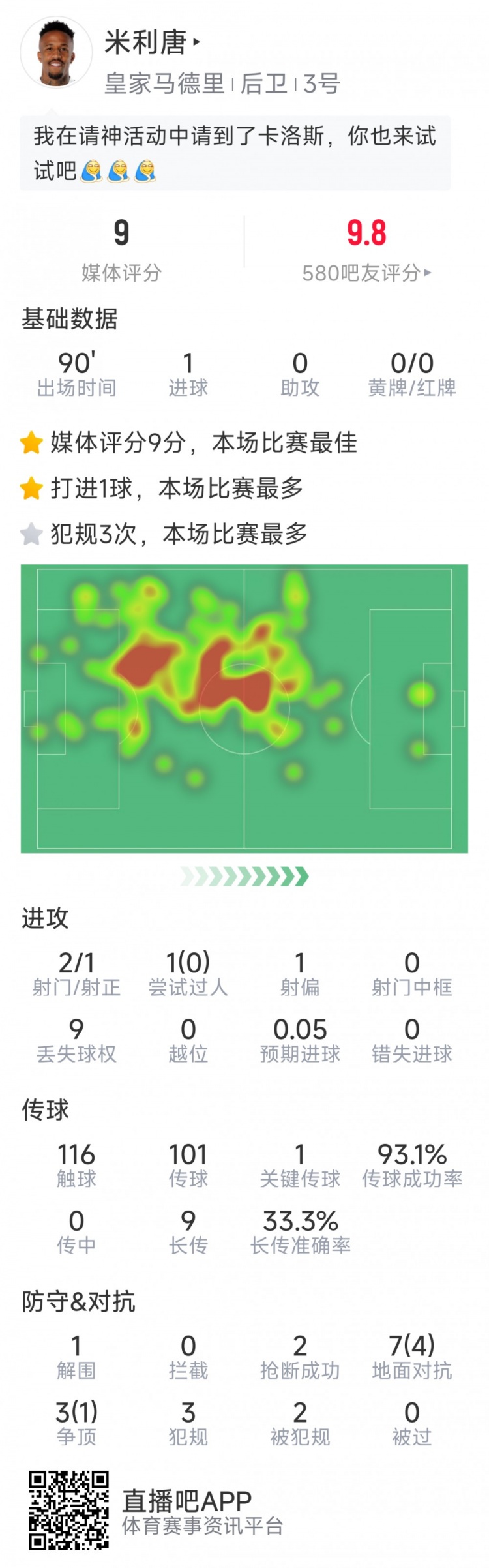 米利唐本场数据:打进惊天远射,2射1正,2次抄截 ,评分9分最高