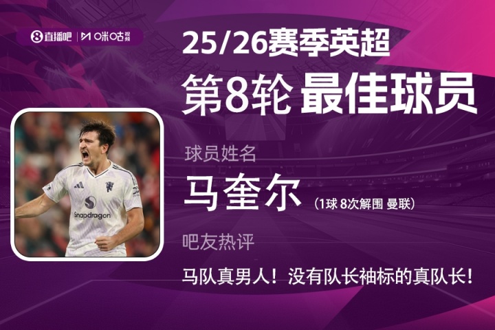 2025-2026赛季英超火热进行中,和咪咕体育联合发起每轮英超最佳球员评选活动!第8轮评选结果出炉,马奎尔双红会8次解围+致胜顶球,帮助曼联2-1击败利物浦,苏超直播红魔终结近10年客战利物浦不胜记录 ,马奎尔赢得吧友近15万的投票,当选【X咪咕体育英超第8轮最佳球员】!