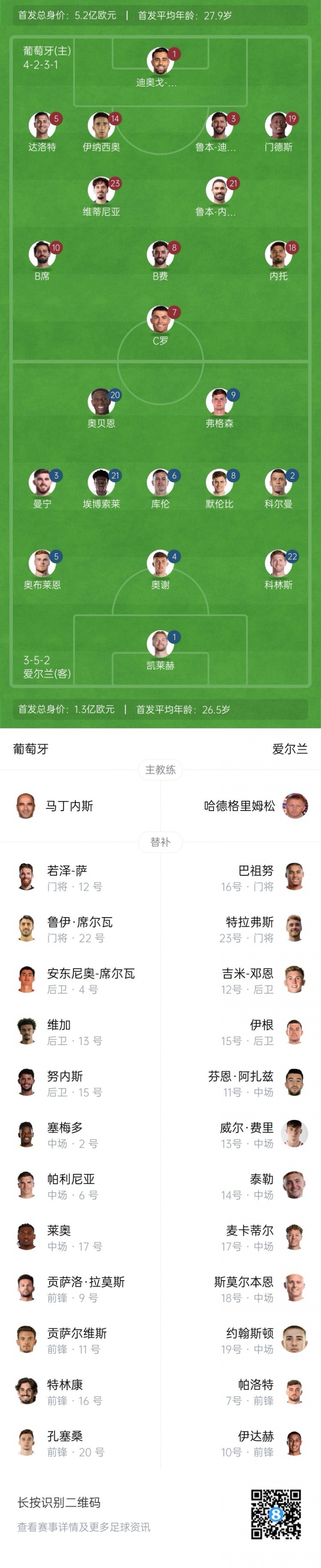 葡萄牙vs爱尔兰杆位:C罗、维蒂尼亚、B费出战